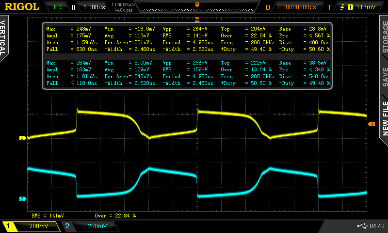 DS2000Above is a capture at 0.3V in. The top waveform is from the toroid output to the base of the 3904 and the bottom waveform was of the LED. This makes it much easier to see the LED being powered by higher voltage pulses from the joule thief circuit. The capture below was taken at around 1.5V in and shows the difference in frequency relative to voltage (excuse the different time bases):