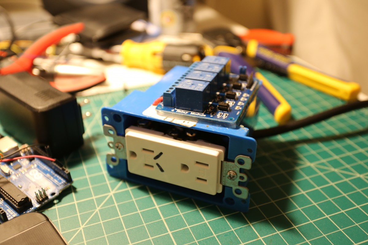 I started with a standard outlet. Adding relays allowed for simple on/off control of devices that have hard power switches (ones that physically stay opened or closed). Current monitoring is provided by a ACS712 series chip. A Bluetooth module was added for wireless communication, as well as an RFID reader for additional interaction.